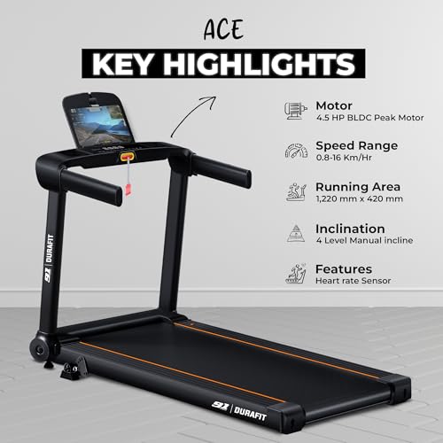 91-Durafit Ace 4.5 HP Peak BLDC Motorized Treadmill | 4 Level Manual Incline | 16 Km/Hr Max Speed | 120 Kg Max User Weight | Home use