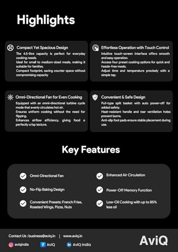 AviQ Air Fryer (Model AF04) exceeded my expectations! The 4.5L capacity is just right for small families or even small gatherings. It cooks everything from fries and nuggets to paneer and veggies perfectly—crispy on the outside, soft inside—and with hardly any oil.