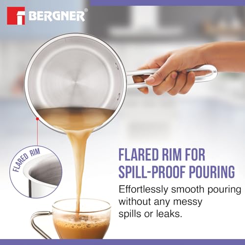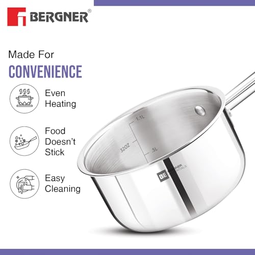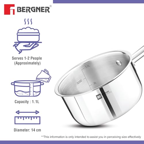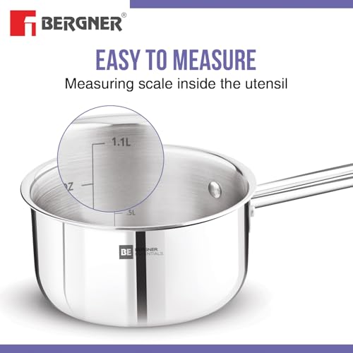 Bergner BE Essentials Triply Stainless Steel 14cm / 1.1 L Teapan, Small Size Milkpan, Saucepan with Rivetless Stay Cool Handle, Healthy Cooking,…