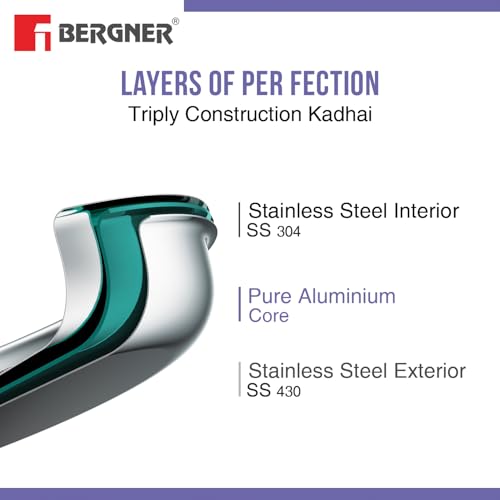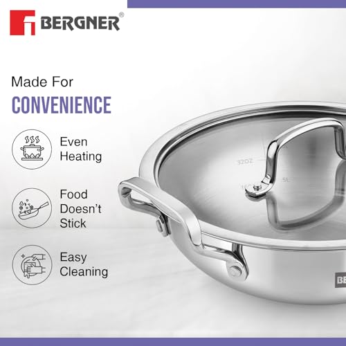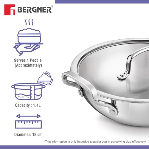 BERGNER BE Essentials Triply Stainless Steel 18cm / 1.4 L Kadai with Flat Glass Lid, Small Size Kadhai, Consumes Less Oil, Healthy Cooking, Mirror…
