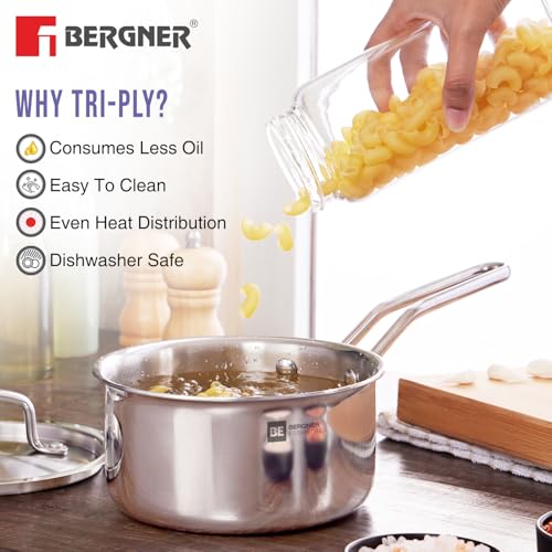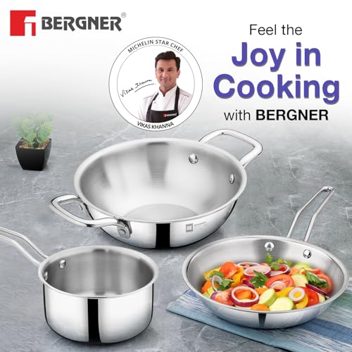 Bergner BE Essentials TriPro TriPly Stainless Steel 3 Pcs Cookware Set – 24cm (3 L) Kadai, 14cm (1.1 L) Teapan, 22cm (1 L) Frypan, Consumes Less…