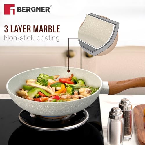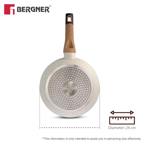 BERGNER Ivory Granite Non-Stick 24cm Frypan, 3-Layer Marble Healthy Coating, Frying Pan with Wooden Soft Touch Rivetless Handle, PFOA Free, Less…