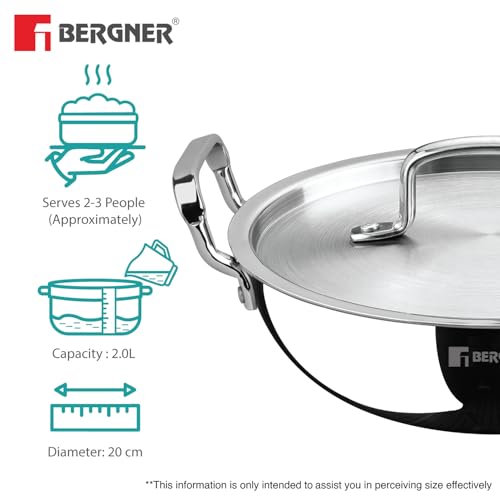 BERGNER TriPro TriPly Stainless Steel 20cm (1.7 L) Deep Kadai/Kadhai with Lid, Durable Stay Cool Handles, Healthy Cooking, Less Oil Use, Metal…