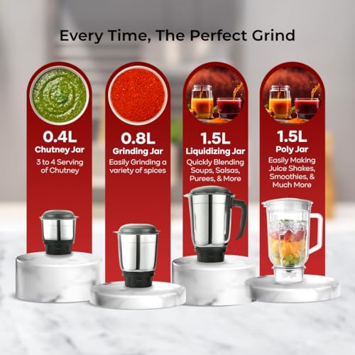 - Durable Build with 4 Multipurpose Jars: 4 Jars (3 Stainless Steel Jars+ 1 Juicer Jar) for versatile usage for liquidizing, dry grinding, and blending for smoothies or masala grinding — making it a perfect blender mixer grinder. A perfect blender mixer grinder for every kitchen.