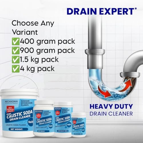 - Strong and Effective Drain Cleaner – NECKKONIX Caustic Soda Flakes are specially formulated to clear tough blockages in sinks, pipes, and drains. They work quickly to dissolve grease, hair, food particles, and other debris that can cause slow drainage or clogs.