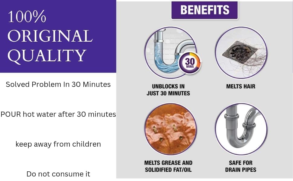 - Fast-acting formula: Works quickly to clear slow-moving or fully clogged drains in minutes. Easy to use: Simply pour the powder into the drain, add water, and let it work. Safe for pipes: Suitable for use with most plumbing systems, including PVC, metal, and ceramic pipes.