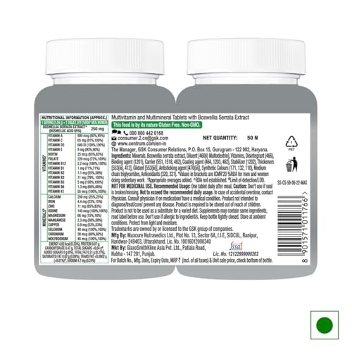 - FORTIFIED WITH MINERALS & BOTANICAL BLEND FOR STRONG JOINTS: Centrum Adult 50+, Multivitamin and Multimineral is a scientifically formulated with scientifically studied ingredients and plant based botanical, Boswellia Serrata, and minerals Calcium and Vitamin D3 to Support strong joints.