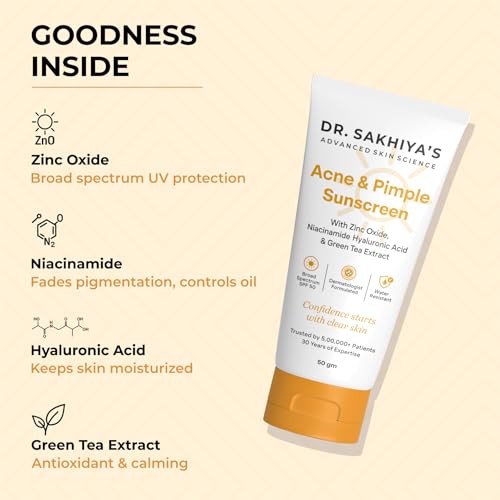 Dr. Sakhiya’s Acne & Pimple Sunscreen SPF 50 with Zinc Oxide (50gm) – Oil-Free, Non-Greasy Formula for Oily & Acne-Prone Skin | Contains…