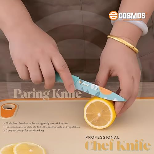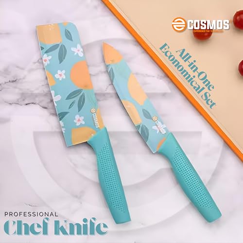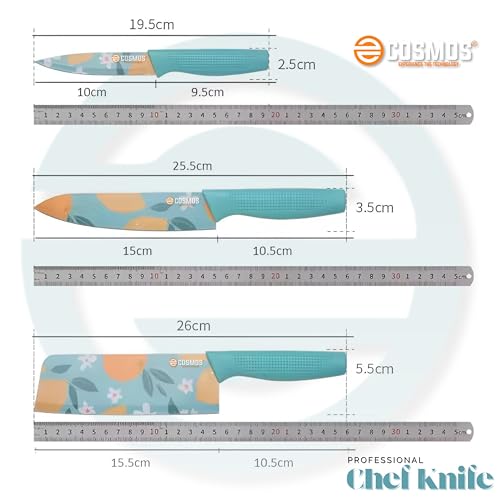 E-COSMOS Professional 3-Piece Kitchen Knife Set – High Carbon Stainless Steel Chef, Utility & Santoku Knives with Ergonomic Blue Handles (3PC) Blue