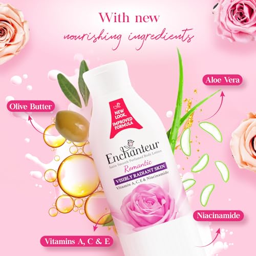- All-Day Moisture Lock: Enchanteur Romantic Satin Smooth Body lotion soothes & tones skin with rose extracts. With the natural goodness of Aloe Vera & Olive Butter, this lotion moisturises and heals dry skin while also revitalising the dullness