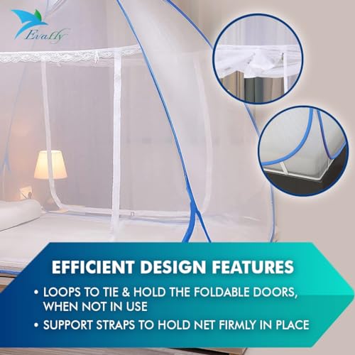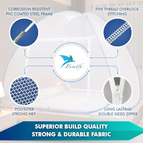 Evafly Mosquito Net for Double Bed | King Size Foldable Machardani | Polyester 30GSM Strong Net |PVC Coated Corrosion Resistant Steel Wire – Blue