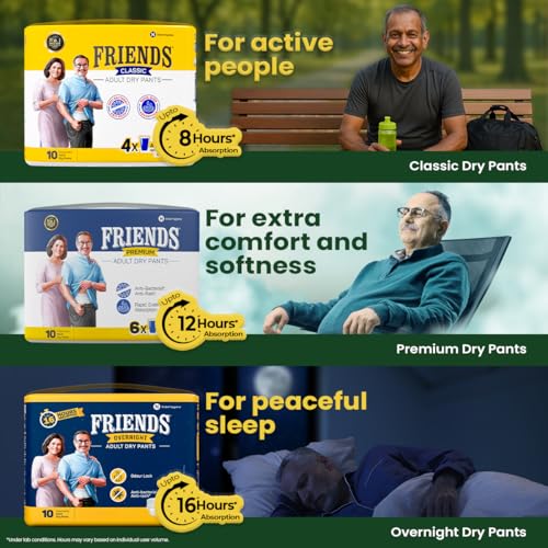 - Friends Adult Diaper medium size pants with 8 hours of protection are also available in sizes L, XL, and XXL.