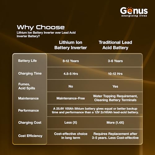 - Maintenance Free : Unlike traditional lead acid batteries which require regular water topping, repairs or replacements, Genus Maxilion 2400 Lithium Ion Inverter get rid of maintenance.