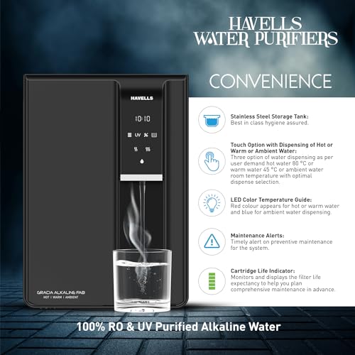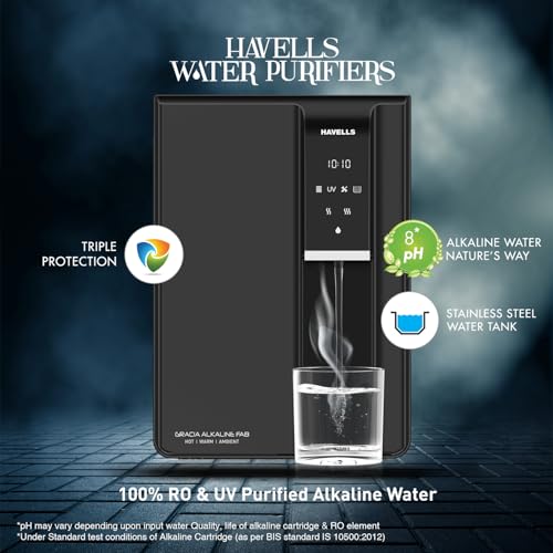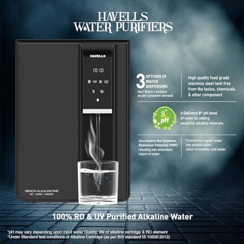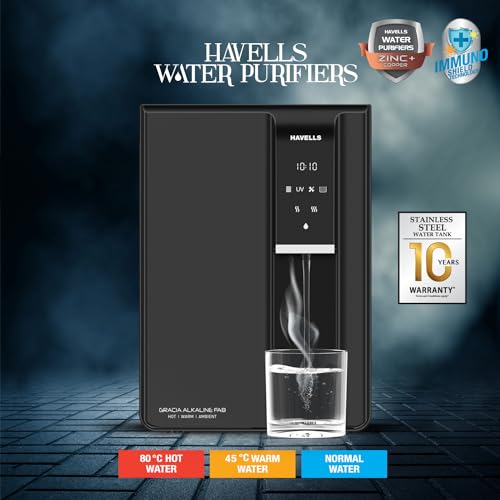 Havells Gracia FAB Alkaline Water Purifier (Black), RO+UV+Alkaline, Hot, Warm & Ambient Water, Copper+Zinc+Minerals, 8 Stage Purification, 6.5L SS…