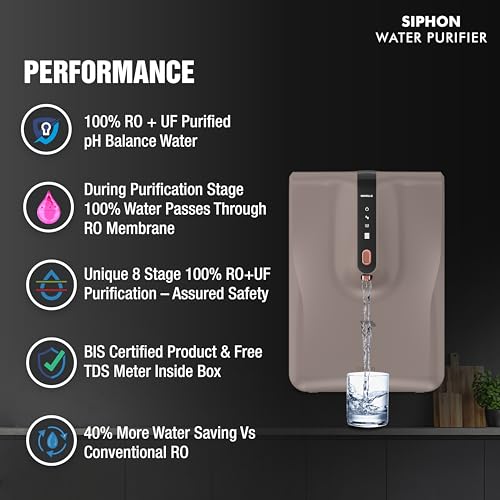 - ✓ DOUBLE PROTECTION: 100 % RO + UF PURIFICATION : A) 100% Water passes through the RO Membrane to ensure absolutely safe and pure drinking water. B) Absolute Safety through 100% UF Purified Water: It removes algae, spores, cysts, bacteria, organic & inorganic polymeric molecules from water, and delivers excellent quality of clear water.