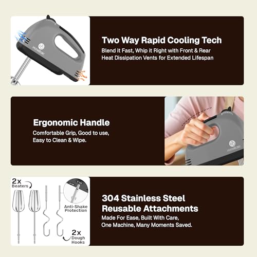 - 🍰Food-Grade Stainless Steel Accessories with Ergonomic Grip : Crafted with high-quality food-grade stainless steel, the beaters and hooks ensure safe and hygienic mixing. The ergonomic anti-slip handle makes it easy to control even during extended use, making this a go-to tool for both beginners and seasoned home bakers.