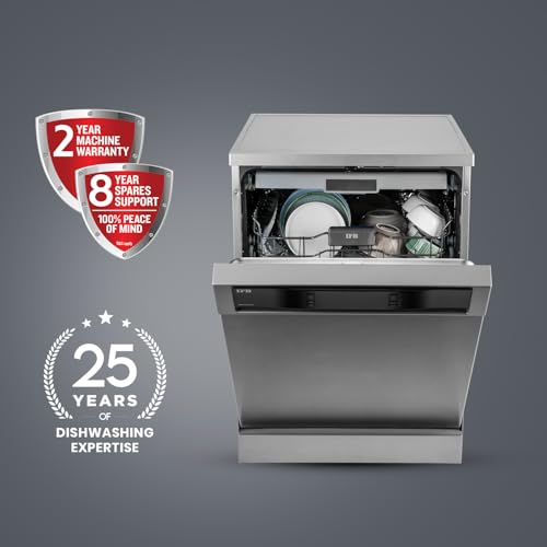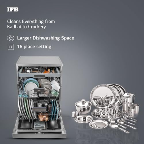 - Freestanding Dishwasher: Affordable, delivers superior wash quality, conserves water, and is easy to use. 16 Place Settings: Spacious enough to fit a full load of dishes, ideal for large families or gatherings. Fits upto 92 Utensils in a single wash cycle | Upper Rack: 8 bowls (250 ml each), 10 glasses (300 ml each), 50 spoons/forks/knives, 8 quarter plates, 8 tea/coffee cups. | Lower Rack: 14 large dinner plates, 8 small dinner plates, 1 kadhai (5L capacity), 1 cooker (5L capacity), 1 tea container (2.5L capacity), 2 strainers, 8 glass bowl containers, 1 tawa. |Additional 3rd Rack: Modular easy-access cutlery tray for forks, spoons, serving spoons, and other small utensils.