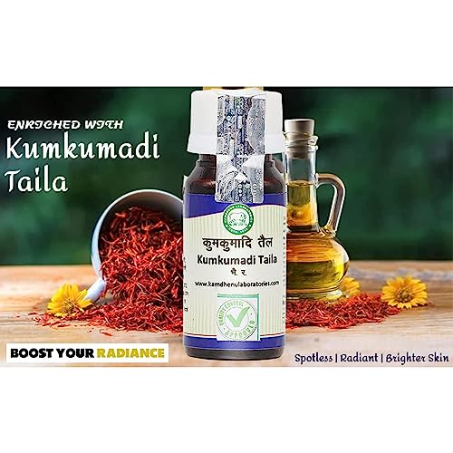 - Kamdhenu’s Kumkumadi oil is based on traditional formulation which may provide you with skin radiance and glow. It may also help in skin lightening and brightening.