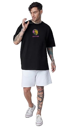 LEOTUDE Men’s Cottonblend Oversized Half Sleeve Round Neck Back Printed Tshirt (Color Black)