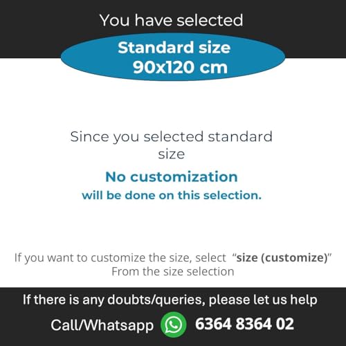 - You have chosen the Standard size 90*120 cms. Please note Customisation on standard sizes won’t be provided. If you need customisation, please chose “size custom” in the size selection drop-down menu. If you need help, please WhatsApp us, or use the Amazon messaging systems.