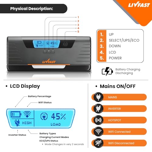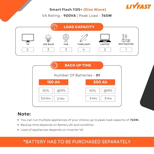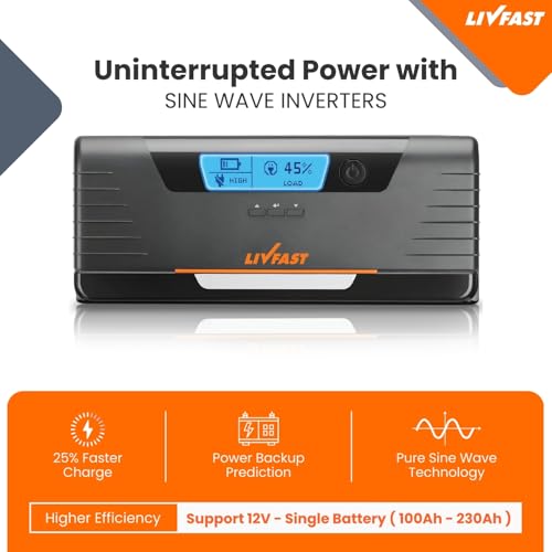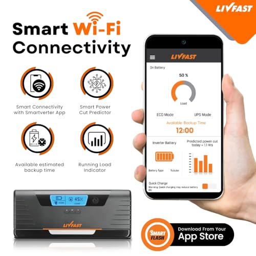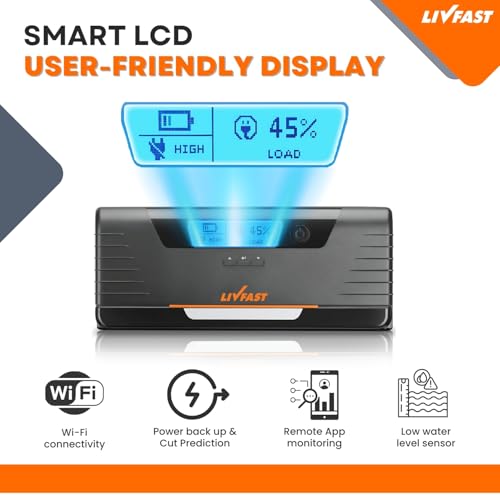 Livfast Smart Flash Pure Sinewave 900VA/12V Inverter with Multi Function LCD Display, Power-Cut Predictor and Smart Mobile App Connectivity |Ideal…