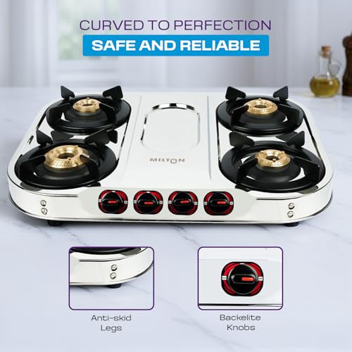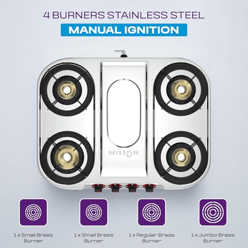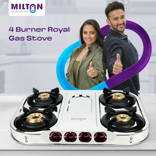 - At amazon.in you can purchase MILTON Royal Stainless Steel Gas Stove 4 Burners | ISI Certified Manual Ignition 4 Burner Gas Stove | 360 Degree Nozzle | High Powered Brass Burners | 1 Year Manufacturer's Warranty for only Rs. 4,979