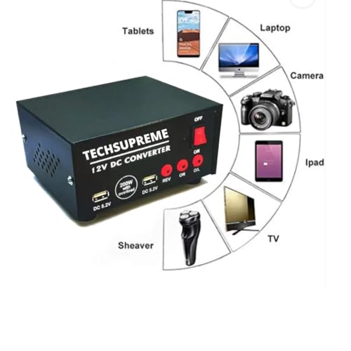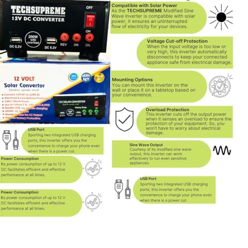 - 200 Watt Converter Can Convert Dc 12v Into Ac 220v Output. It Has Also A 5.2v USB Port You Can Easily Charge You Mobile Via Data Cable Without Your Charger Adapter.it Is A Well Design For Frequently Flow Current & Use For Color Tv, Cfl, Dth, Dvd, and Solar Converter.