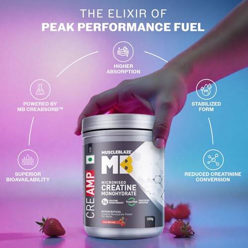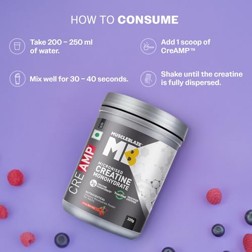 MuscleBlaze Micronised Creatine Monohydrate CreAMP Powder, Juicy Berries (80 Servings, 320g) | Trustified Certified Creatine