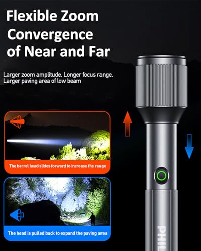 - 【Telescopic Zoom】Adjustable high and low beams, adjustable illumination range through telescopic flashlight, 900 meter long focusing beam for further illumination, 70 ° defocused short distance wide range illumination for clearer field of view. Whether focused or defocused, it can present perfect light shape
