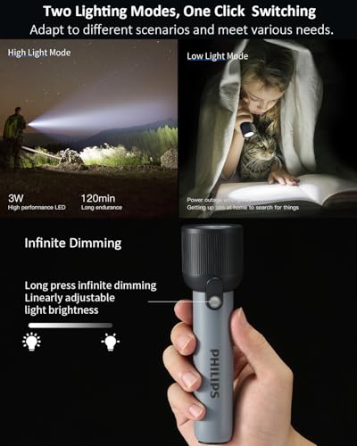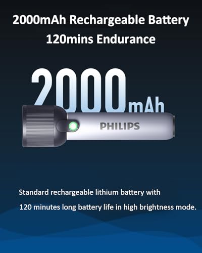 PHILIPS Handheld Torch Light, 2000mAh Rechargeable LED Torch Light with 2 Modes,400LM & IP44 Waterproof, Portable Flash Light for Home, Camping,…
