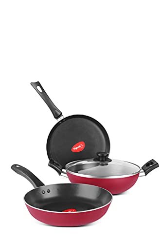 - Included components: 1 Non-stick Kadai With Glass Lid, 1 Non-stick Fry Pan and 1 Non-stick Flat Tawa; Colour: Red