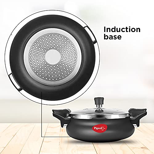 - Material: Hard Anodized Aluminium ; Size: Bowl (3 Litres); Base type: Induction Base; Base thickness: 3.8 mm; Included components: 1 Bowl, 1 Strainer Lid, 1 Pressure Cooking Lid and 1 Serving Lid; Colour: Black. Ceramic Coating