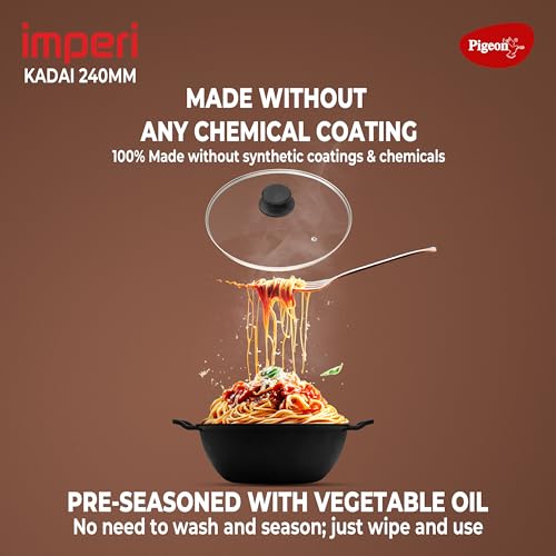 Pigeon Cast Iron Kadai with Glass Lid | 24 cm | Naturally Nonstick | Pre-Seasoned with 100% Vegetable Oil | Toxin-Free | High Pressure Casting | Bring Back Nostalgic Taste