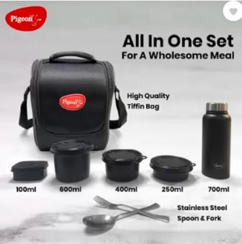 Pigeon by Stovekraft Heat and Treat Lunch Box Pack of 4 Microwave Safe, Leak Proof| 600ml,400ml,250ml,100ml | 750ml Black Bottle (1 year Warranty)