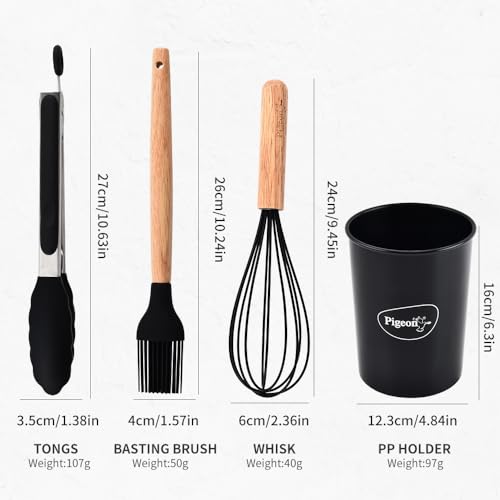 Pigeon by Stovekraft Silicone Kitchen Utensils Spoon Spatula Cooking Set- 12 Pcs with Wooden Handle|BPA Free|Heat Resistant Item|Flexible Non Toxic Silicon|Non Stick|Cookware Tools with Holder Black