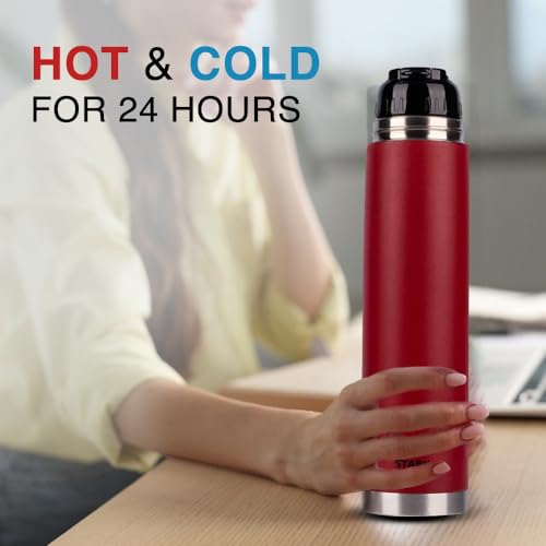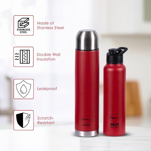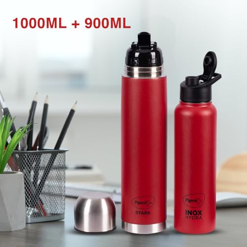 Pigeon by Stovekraft Therminox Stark Plus Vacuum Insulated Flask 1000ml Red + INOX Hydra Red 900ml Bottle Combo, (Red)