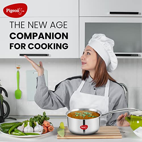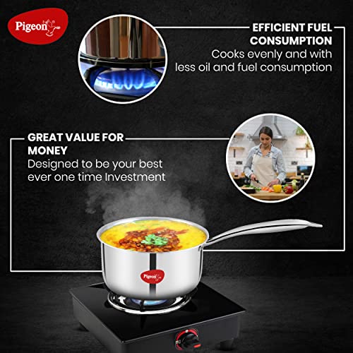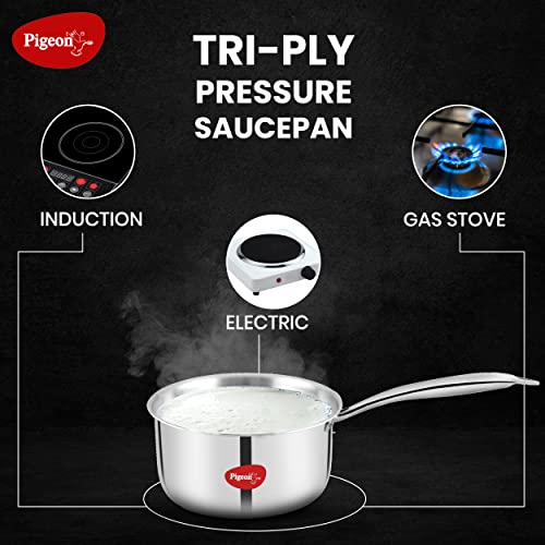 Pigeon Elite Stainless Steel Triply Sauce Pan 14 cm, Gas Stove and Induction Compatible for Fast Cooking and Longer Heat Retention, Along with Even Heat Distribution- Silver