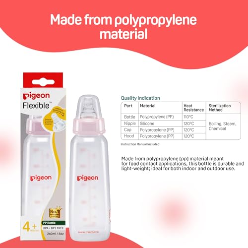 - Pigeon Peristaltic Feeding Bottle is ideal for 4+ month babies and made from durable quality plastic