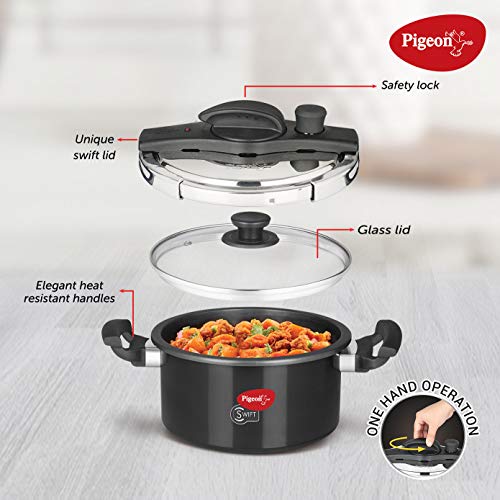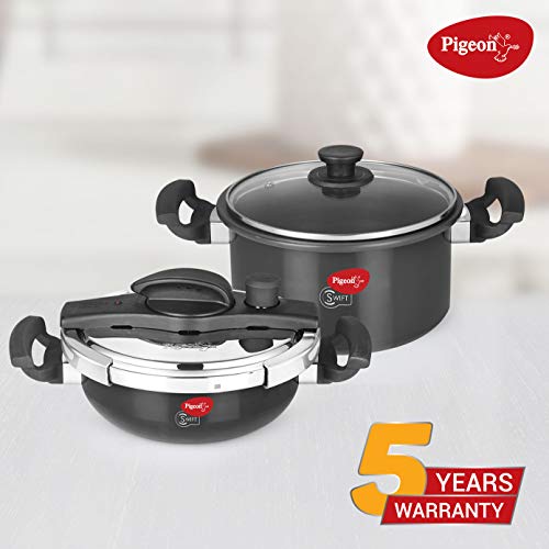 Pigeon Swift_12783 Aluminium Outer lid Pressure Cooker, Kadai Cooker Combi Pack, 4L + 2L, Black