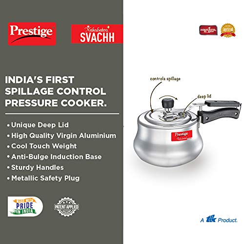- The Nakshatra Plus Svachh Pressure handi is designed to last longer and comes with a unique lid that contains any spillage that might occur during the course of cooking and prevents the messy liquid from dripping down.