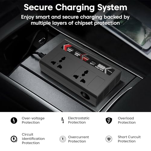 - ✅ 【Enhanced Multi-Protection System for Safety】 Designed with a durable ABS insulated shell and built-in smart chip, this inverter provides complete protection for your car battery, electrical appliances, and the inverter itself. The multi-protection system safeguards against overheating, under-voltage, over-voltage, overload, and short circuits, ensuring safe and stable charging. If the indicator light turns red, it means the protection mechanism has been activated, preventing potential damage to your devices.