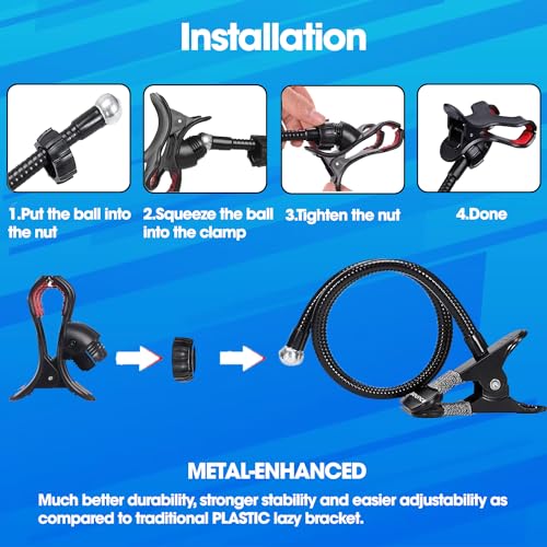 - ✅【Easy Installation】: The robust metal clamp can be adjusted to fit surfaces up to 2.5 inches thick. This makes it ideal for attaching to desks, chairs, tables, beds, kitchen counters, and even in your car. Please remember to coil up the gooseneck when using heavy phones for added stability.