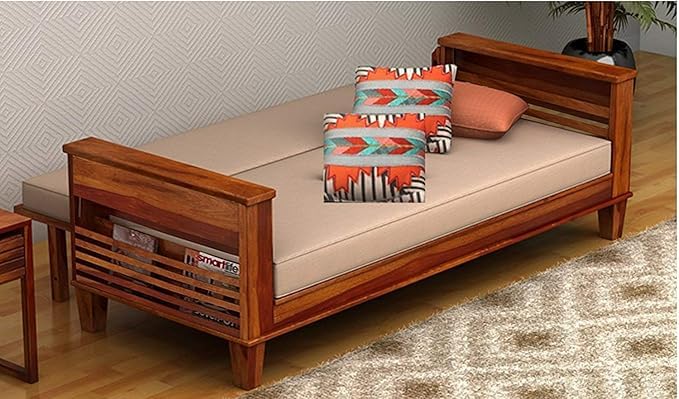 - Primary Material: Sheesham Wood, Style: Contemporary, Color: Honey Finish, With Mattress and without Cushions
