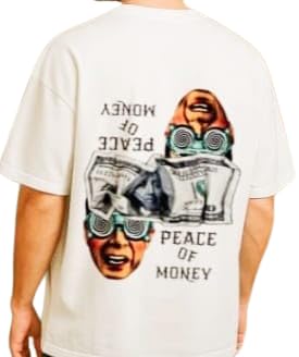 Make a bold statement with this striking white regular fit t-shirt featuring unique graphic art on the back. The minimalist front design offers clean sophistication, while the back showcases an artistic interpretation of currency and stylized faces with the text ‘Peace of Money’. Crafted for comfort with a relaxed silhouette, this t-shirt pairs perfectly with dark trousers or jeans for a contemporary street-style look. The oversized fit provides unrestricted movement while maintaining a fashionable profile. The high-quality cotton construction ensures durability and comfort for all-day wear. The distinctive back print makes this piece a conversation starter and adds an edgy element to your casual wardrobe. Perfect for those who appreciate artistic expression and contemporary fashion statements. Available in white, this versatile piece can be dressed up or down for various occasions.
