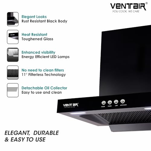 - 11° Filterless with Metallic Oil Collector: Ventair has specially designed filterless filters inclined at an 11° angle which directs the oil and grime into the oil collector, thus preventing the oil from dripping on the kitchen surface. The 100% metallic oil collector is sturdy and strong. It is also detachable and easy to clean, thus reducing maintenance.