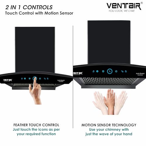 - Motion Sensor Technology with Feather Touch Control: This Ventair kitchen chimney is very quick and easy to operate. This chimney comes with latest motion sensor technology, that is, operate the chimney by just using the wave of your hand. There is a feather touch control panel which protects you from any chances of electric shocks and gives your chimney an elegant look too. You can use the multiple speed settings to conveniently adjust the chimney power as per your cooking style.