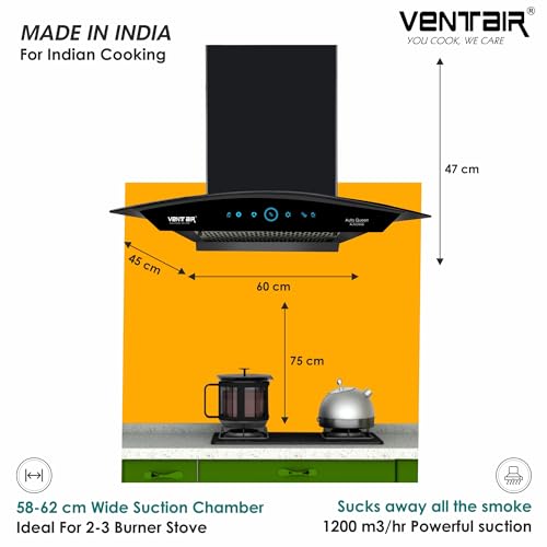 - Powerful Suction: Ventair Chimney Auto Queen comes with powerful maximum suction capacity of 1200 m3/hr. So it can effectively draw-in smoke and fumes from your kitchen. It has a wide suction chamber which effectively covers all the area above your burner stove, thus offering you a clean and healthy cooking environment.