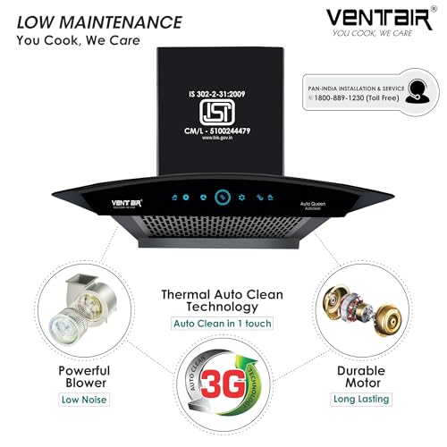 - Warranty: Ventair Chimney Auto Queen is ISI Certified (CML No. : 5100244479) and also comes with the comprehensive product warranty of 1 year and 5 years motor warranty by Ventair.