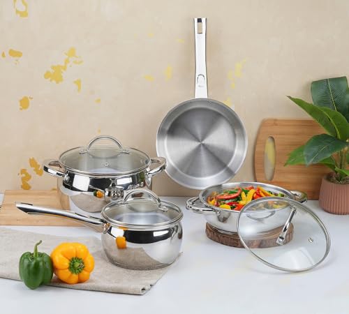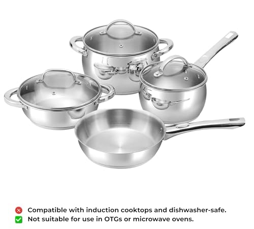 Vinod Letten Stainless Steel Cookware Set – 4 Pcs, Frypan 1.5 L, Kadai 2 L, Saucepan 2.2 L, Saucepot 4.2 Litre with Glass Lid, Even Heating SAS…
