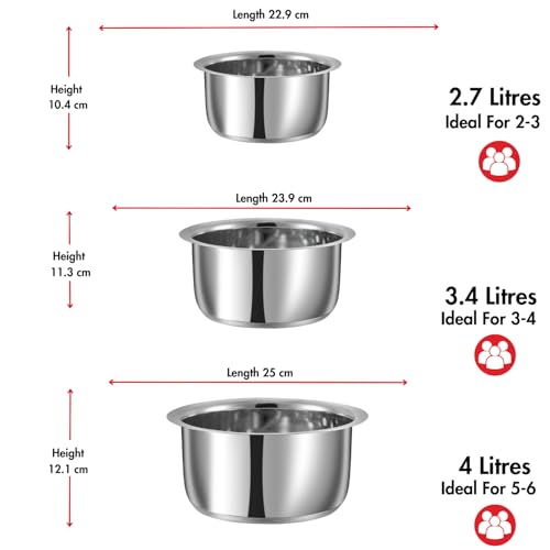 Vinod Stainless Steel Capsule Bottom Tope/Patila Combo Set of 3 Pcs – 2.7 Liter (14cm), 3.4L (15cm), And 4L (16Cm Diameter) – Silver